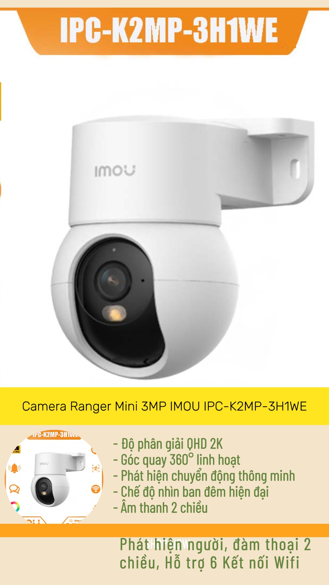 Camera IMOU IPC-K2MP-3H1WE, còn được gọi là Imou Ranger Mini 3MP, là một camera Wi-Fi quay quét trong nhà với nhiều tính năng thông minh. Dưới đây là thông số kỹ thuật chi tiết của nó: